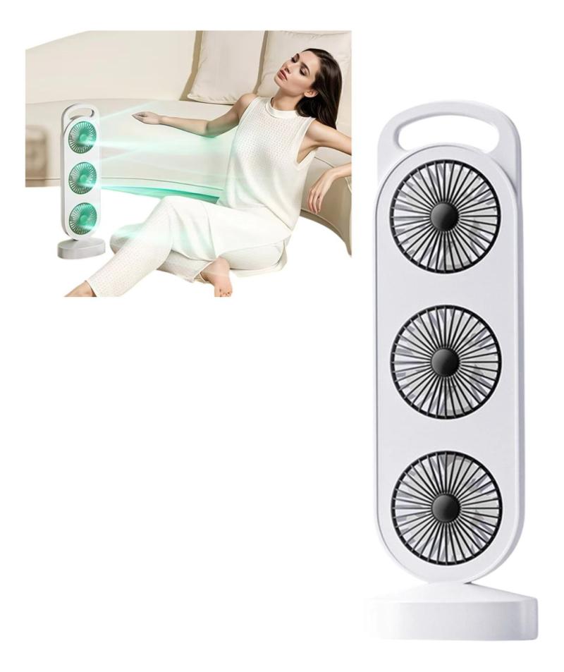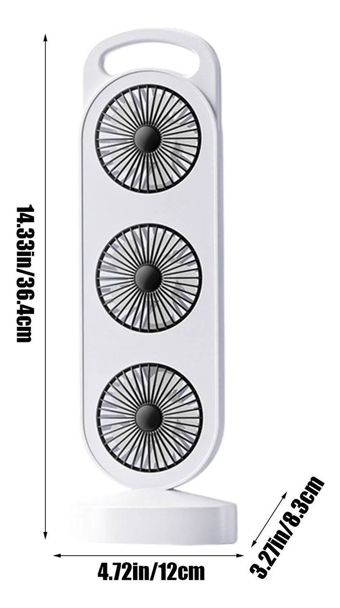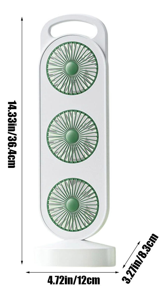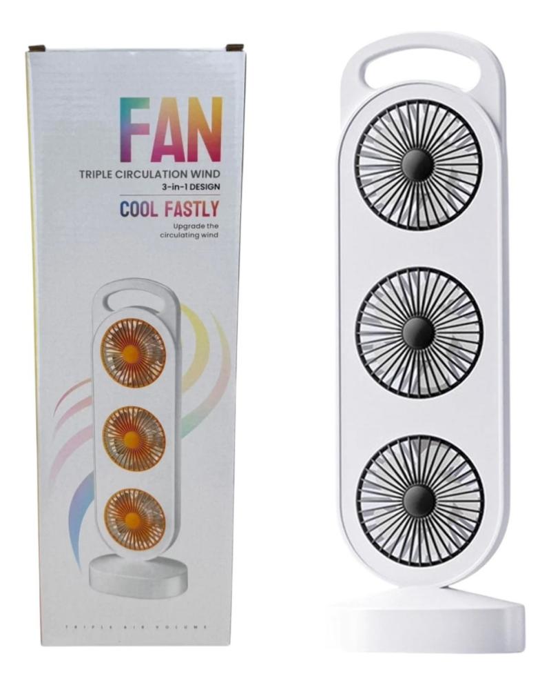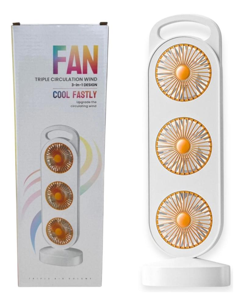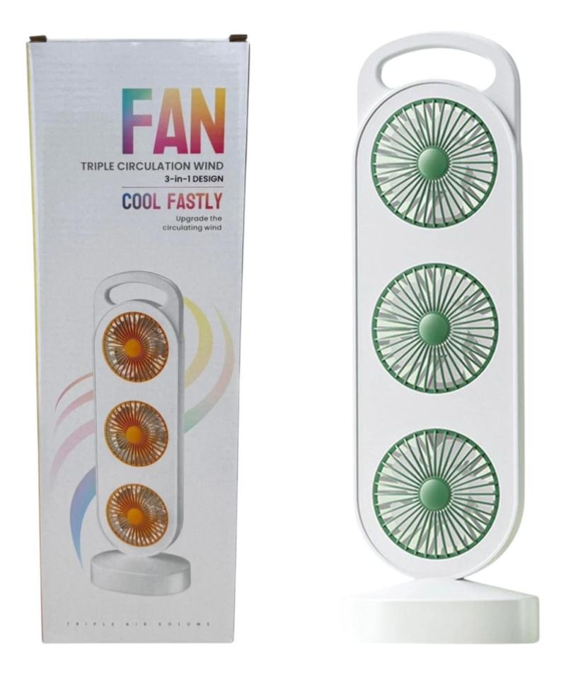 MINI VENTILADOR DE ESCRITORIO 3 en 1 FN-27 Ventilador vertical inalámbrico diseñado con una configuración de "triple núcleo": posee tres ventiladores independientes apilados que trabajan en simultáneo para ampliar el área de cobertura vertical del viento. Es ideal para espacios reducidos, escritorios o uso personal, permitiendo moverlo fácilmente a cualquier parte gracias a su manija de transporte integrada y su funcionamiento a batería. Dimensiones: 37 cm de alto x 10 cm de ancho (diámetro de la base). Materiales: Cuerpo de plástico ABS ligero en color blanco con manija superior. Rejillas de seguridad tupidas para protección de los dedos. Funciones: Triple Acción: Tres cabezales de ventilación funcionando al mismo tiempo. Portabilidad: Diseño delgado y sin cables fijos. Control Simple: Un único botón físico en la base para encendido y gestión de potencia. Specs técnicas: Potencia de consumo 3W. Voltaje de operación 3.7V. Alimentación: Batería interna recargable. Se carga mediante puerto USB (cable incluido). Contenido: 1 Ventilador torre triple S31. 1 Cable de carga USB.