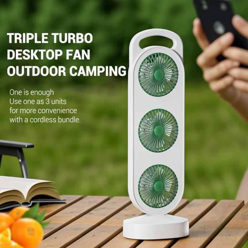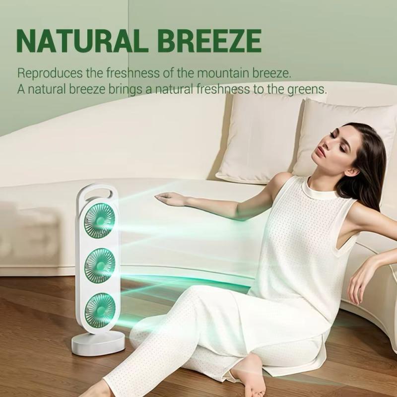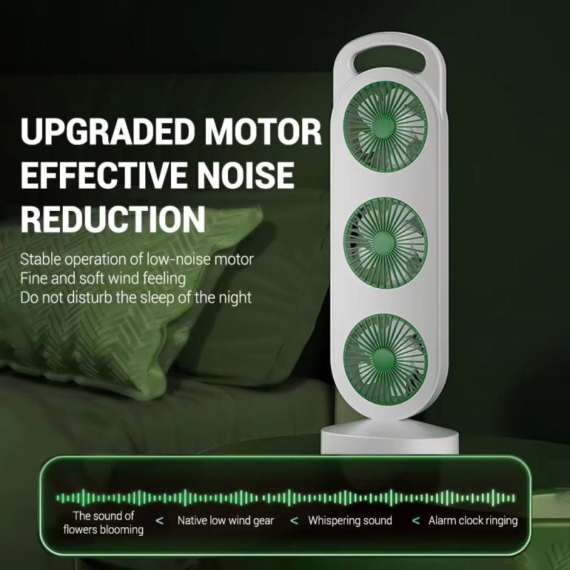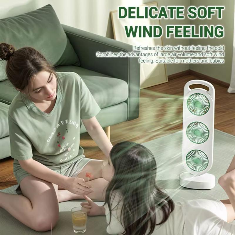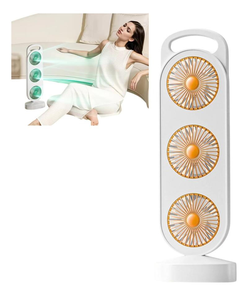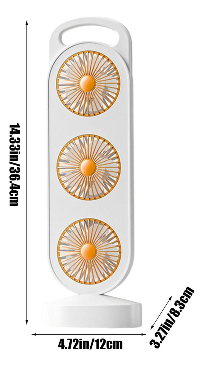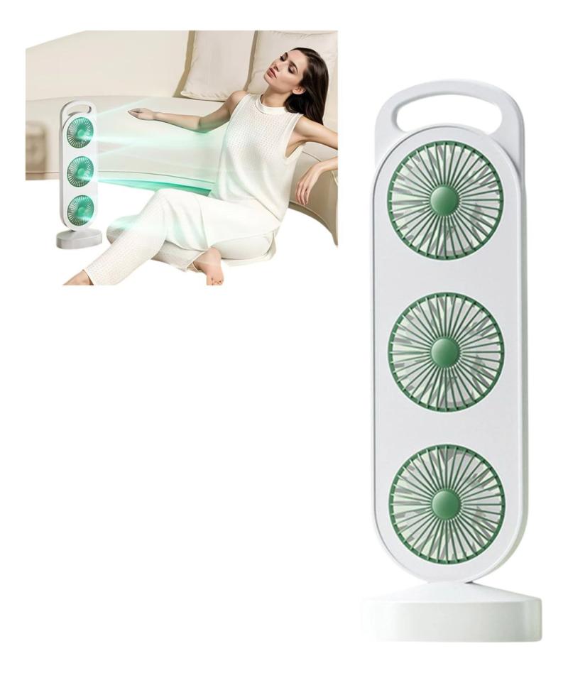MINI VENTILADOR DE ESCRITORIO 3 en 1 FN-27 Ventilador vertical inalámbrico diseñado con una configuración de "triple núcleo": posee tres ventiladores independientes apilados que trabajan en simultáneo para ampliar el área de cobertura vertical del viento. Es ideal para espacios reducidos, escritorios o uso personal, permitiendo moverlo fácilmente a cualquier parte gracias a su manija de transporte integrada y su funcionamiento a batería. Dimensiones: 37 cm de alto x 10 cm de ancho (diámetro de la base). Materiales: Cuerpo de plástico ABS ligero en color blanco con manija superior. Rejillas de seguridad tupidas para protección de los dedos. Funciones: Triple Acción: Tres cabezales de ventilación funcionando al mismo tiempo. Portabilidad: Diseño delgado y sin cables fijos. Control Simple: Un único botón físico en la base para encendido y gestión de potencia. Specs técnicas: Potencia de consumo 3W. Voltaje de operación 3.7V. Alimentación: Batería interna recargable. Se carga mediante puerto USB (cable incluido). Contenido: 1 Ventilador torre triple S31. 1 Cable de carga USB.