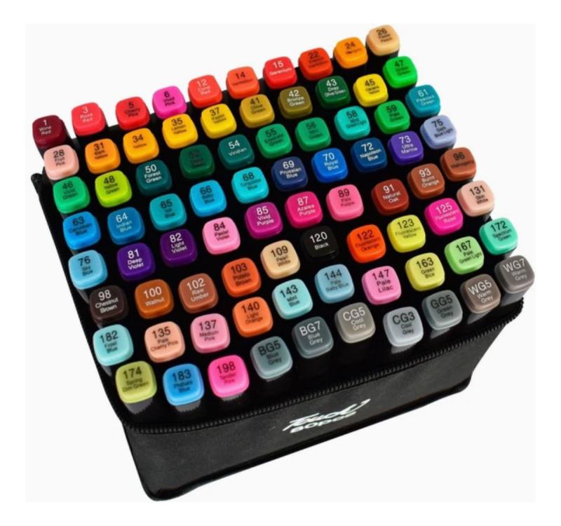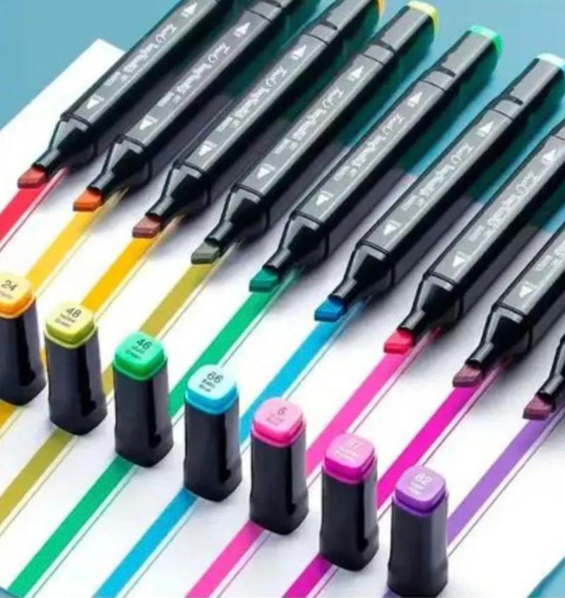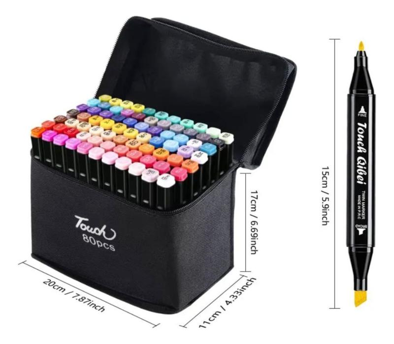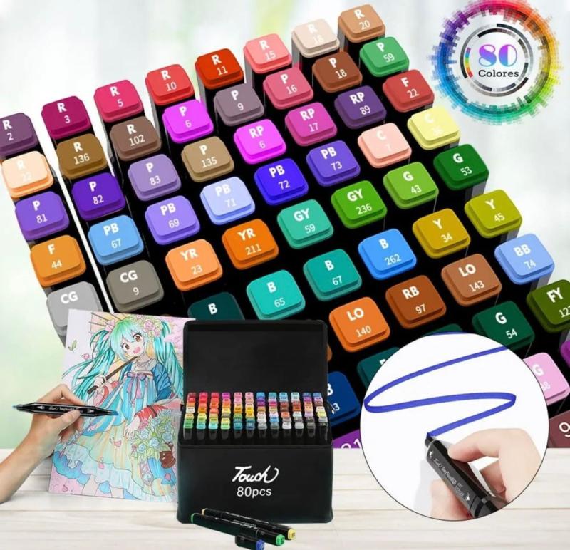 SET ESTUCHE CON MARCADORES 80pcs EK080 Los marcadores touch son fibras con doble punta que se pueden usar para dibujar, colorear, ilustrar, hacer bocetos, entre otros -Tienen una punta de pincel suave y otra biselada. -Su tinta a base de alcohol o agua garantiza colores vibrantes y duraderos. -Son ideales para trabajar en diferentes tipos de papel. Los marcadores Touch son ideales para generar colores llenos, degradados, mezcla de tonos, superposición y difuminados Para usar el marcador se puede: 1. Aplicar el plumón en el papel 2. Pintar con un color mientras la zona está húmeda 3. Difuminar un color mientras la tinta de color está húmeda Los plumones Touch son útiles para el diseño de escritura, dibujo, animación, paisaje, vestuario, interior, arquitectura, estudiante y sketch de artista. Usos Son ideales para estudiantes, artistas y aficionados al arte. Son perfectos para quienes disfrutan de la ilustración, el diseño gráfico, la caligrafía. Son ideales para resaltar detalles en obras. Son ideales para añadir un toque de color a notas y trabajos escolares. Son ideales para hacer lettering.